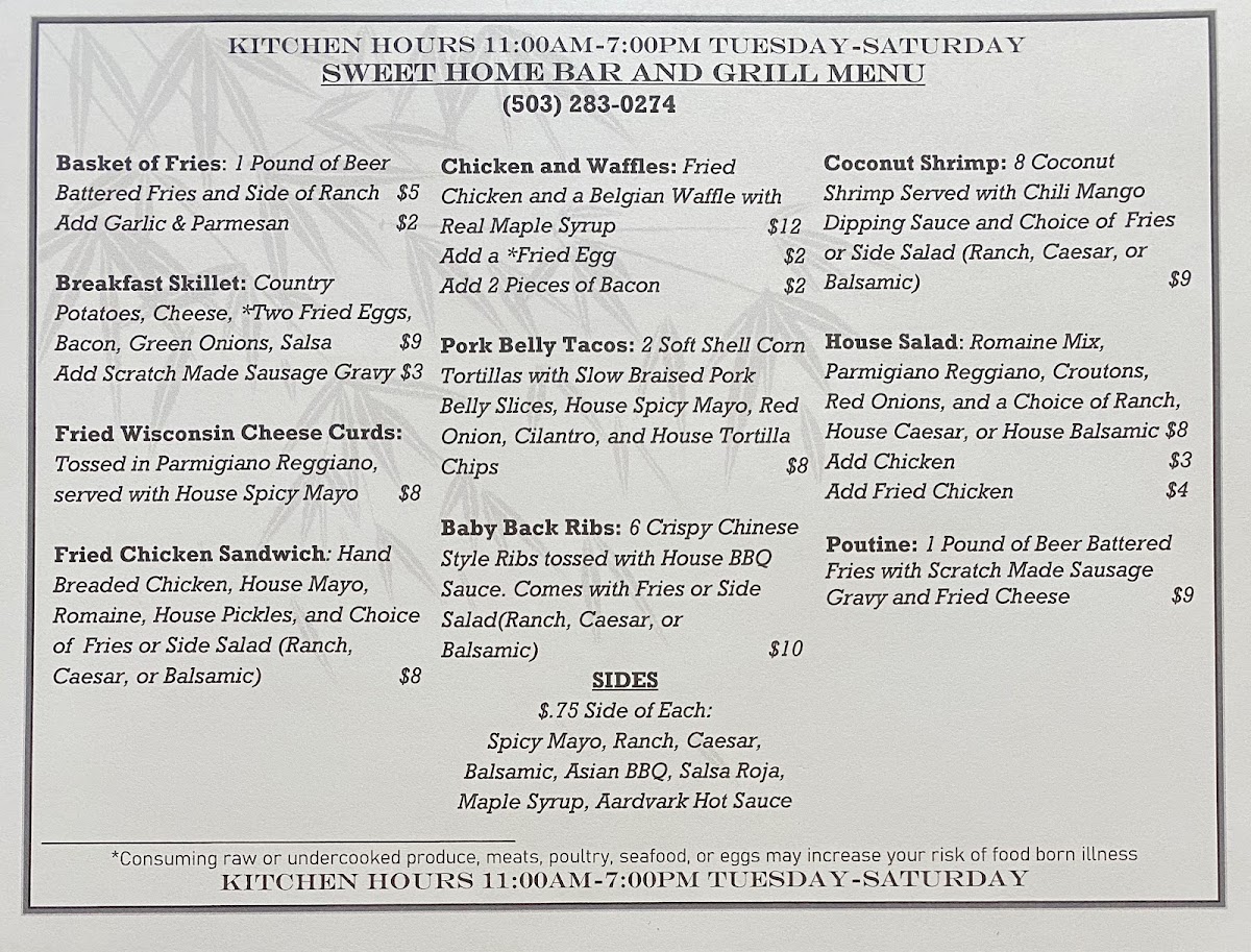 Welcome to Sweet Home Bar & Grill, located at 2824 N Lombard St in Portland, where comfort food meets a lively atmosphere. Our menu is a delightful blend of classic bar favorites and new flavors. Experience our delectable Chicken Wings, served crispy and spicy, alongside our indulgent Mozzarella Sticks. For those craving something heartier, our signature burgers made from homemade patties promise to satisfy, topped with gooey melted cheese and served with crispy fries.